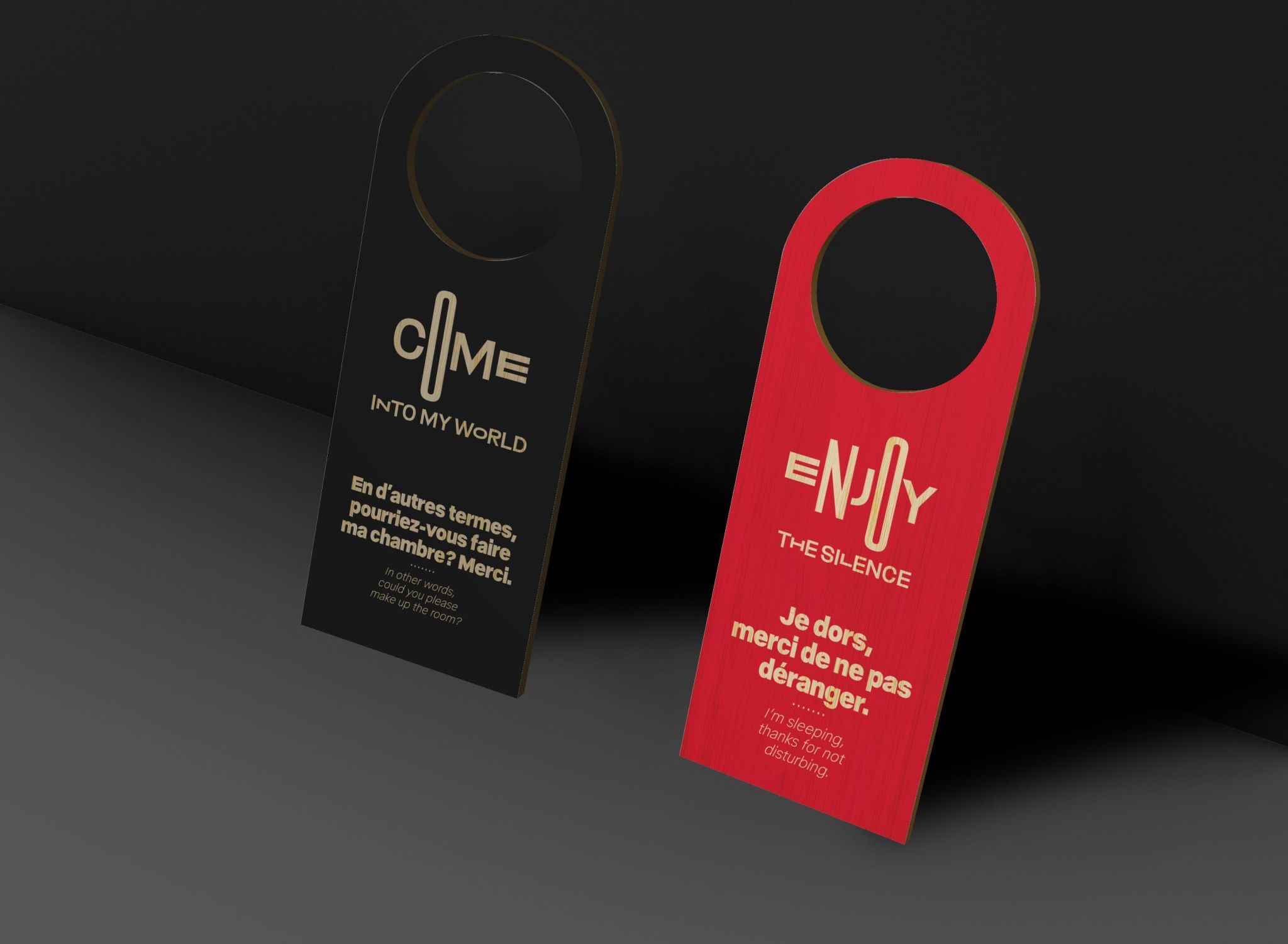 We produce the most common hotel room door hangers like “Do Not Disturb” and “Please Make Up Room” signs. Choose from classic double-sided designs (DND / Service Room), multilingual DND signs, and icon-led designs for clear guest communication.